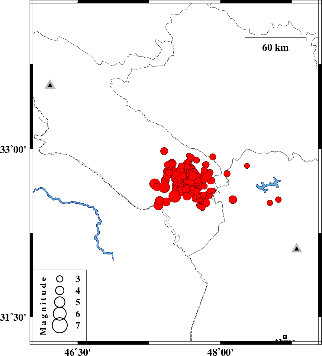 | 2014/08/19 | 00:28:55.7 | 04:58:55.7 | 32.76 | 47.56 | 14 | ML4 | Ilam Province, 21 km South of Abdanan | ||