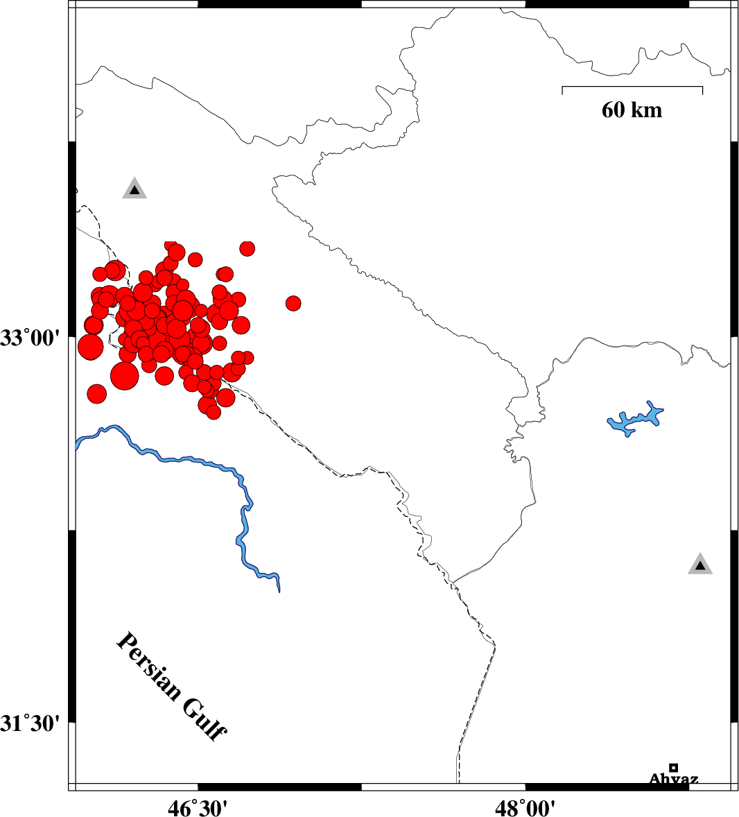 | 2014/08/18 | 05:25:51.3 | 09:55:51.3 | 32.69 | 47.61 | 14 | ML5.8 | Ilam Province, 33 km East of Dehloran | ||