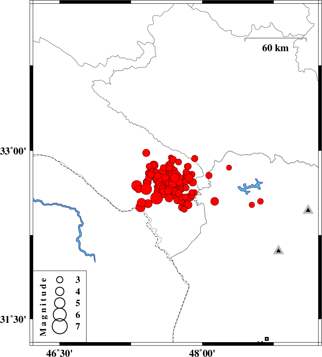 | 2014/08/19 | 00:28:55.7 | 04:58:55.7 | 32.76 | 47.56 | 14 | ML4 | Ilam Province, 21 km South of Abdanan | ||