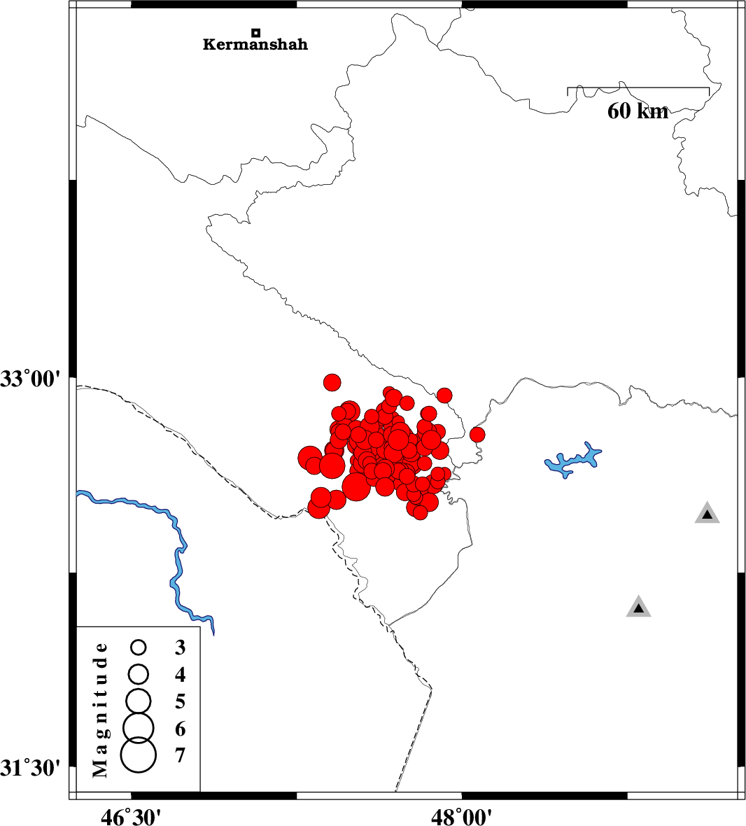 | 2014/08/17 | 14:47:20.3 | 19:17:20.3 | 32.7 | 47.64 | 16 | ML5 | Ilam Province, 36 km East of Dehloran | ||