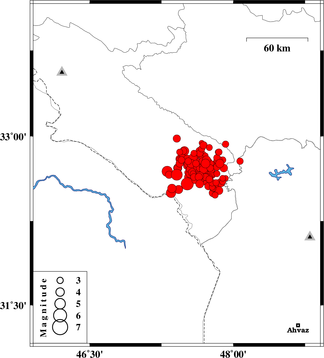 | 2014/08/18 | 05:25:51.3 | 09:55:51.3 | 32.69 | 47.61 | 14 | ML5.8 | Ilam Province, 33 km East of Dehloran | ||