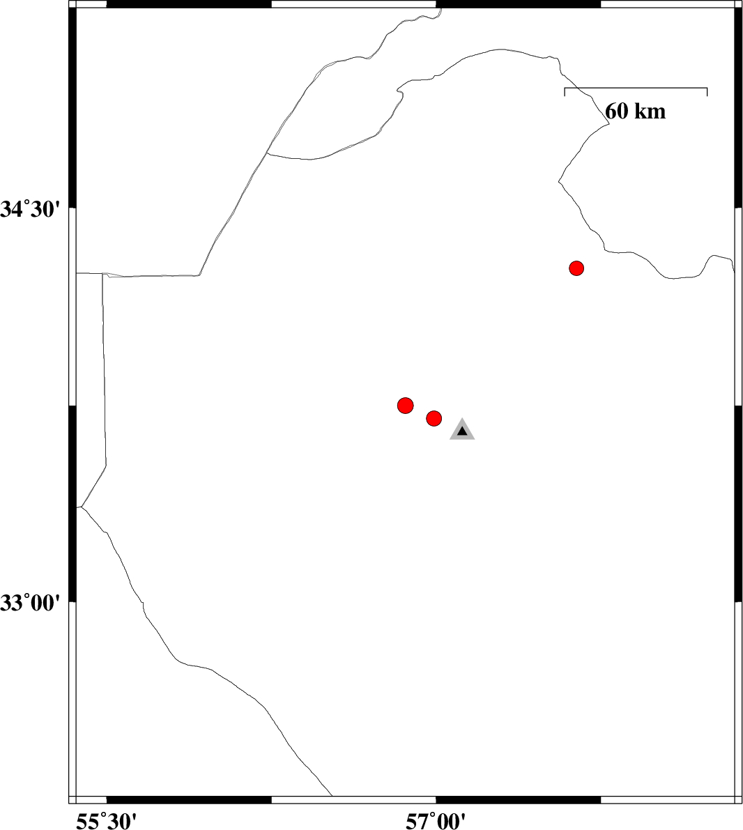 | 2014/08/20 | 16:02:09.8 | 20:32:09.8 | 33.75 | 56.86 | 14 | ML3.2 | Yazd Province, 18 km North of Tabas | ||