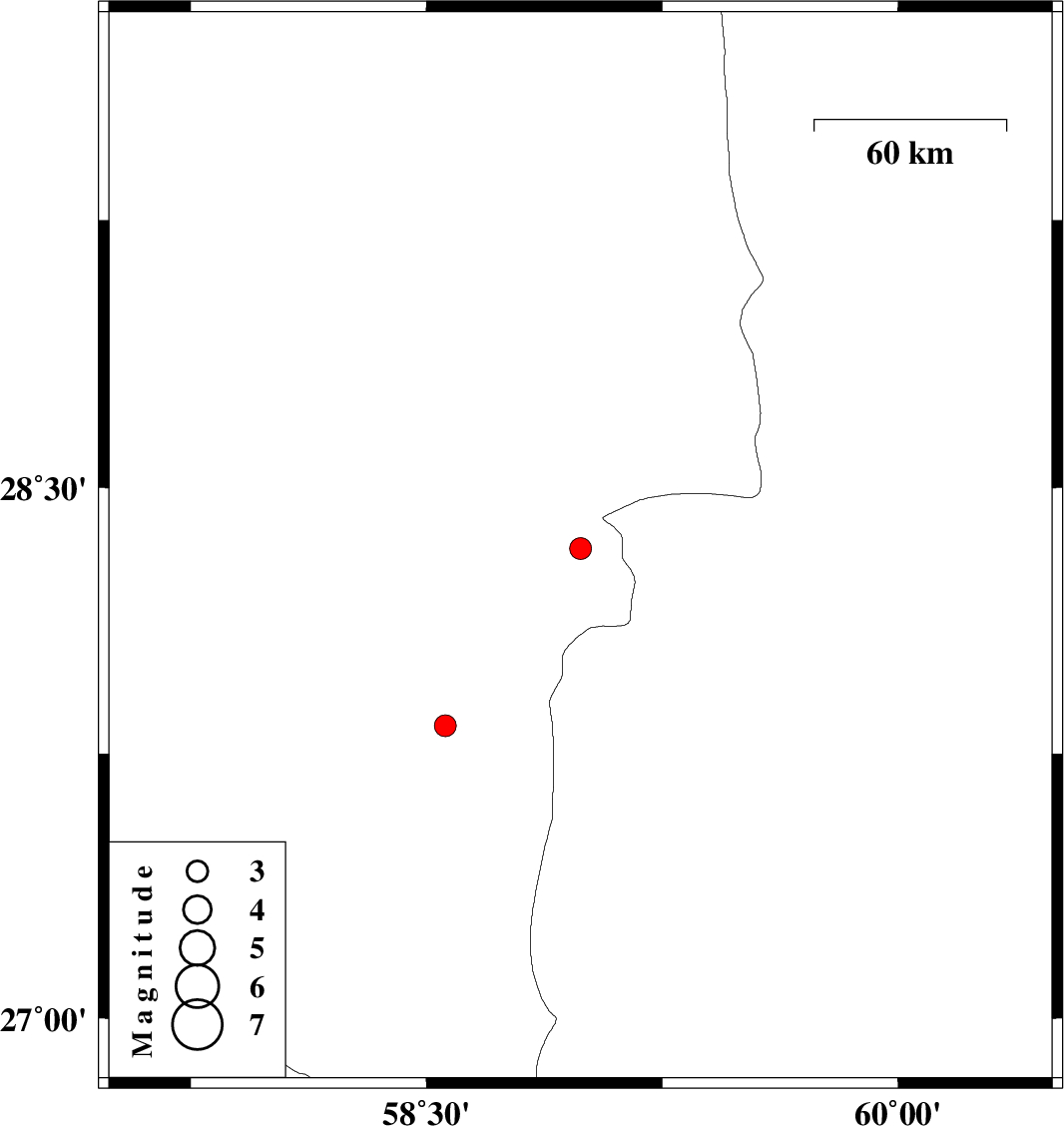 | 2014/08/16 | 07:42:23.5 | 12:12:23.5 | 27.83 | 58.56 | 15 | ML3.1 | Kerman Province, 86 km South-East of Kahnuj |