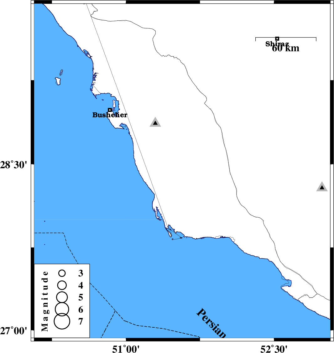 | 2014/08/24 | 18:55:14.6 | 23:25:14.6 | 28.43 | 51.57 | 27 | ML3.1 | Bushehr Province, 31 km South-East of Khormog |