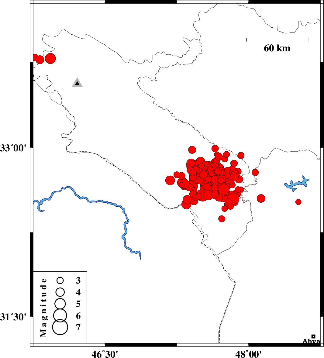 | 2014/08/23 | 20:18:05.7 | 00:48:05.7 | 32.72 | 47.69 | 14 | ML3.8 | Ilam Province, 31 km South-East of Abdanan | ||