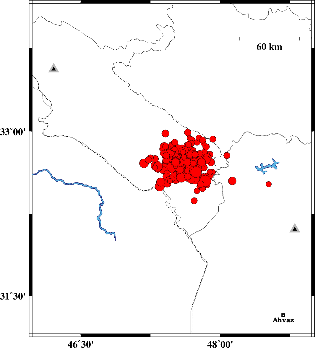 | 2014/08/23 | 20:18:05.7 | 00:48:05.7 | 32.72 | 47.69 | 14 | ML3.8 | Ilam Province, 31 km South-East of Abdanan | ||