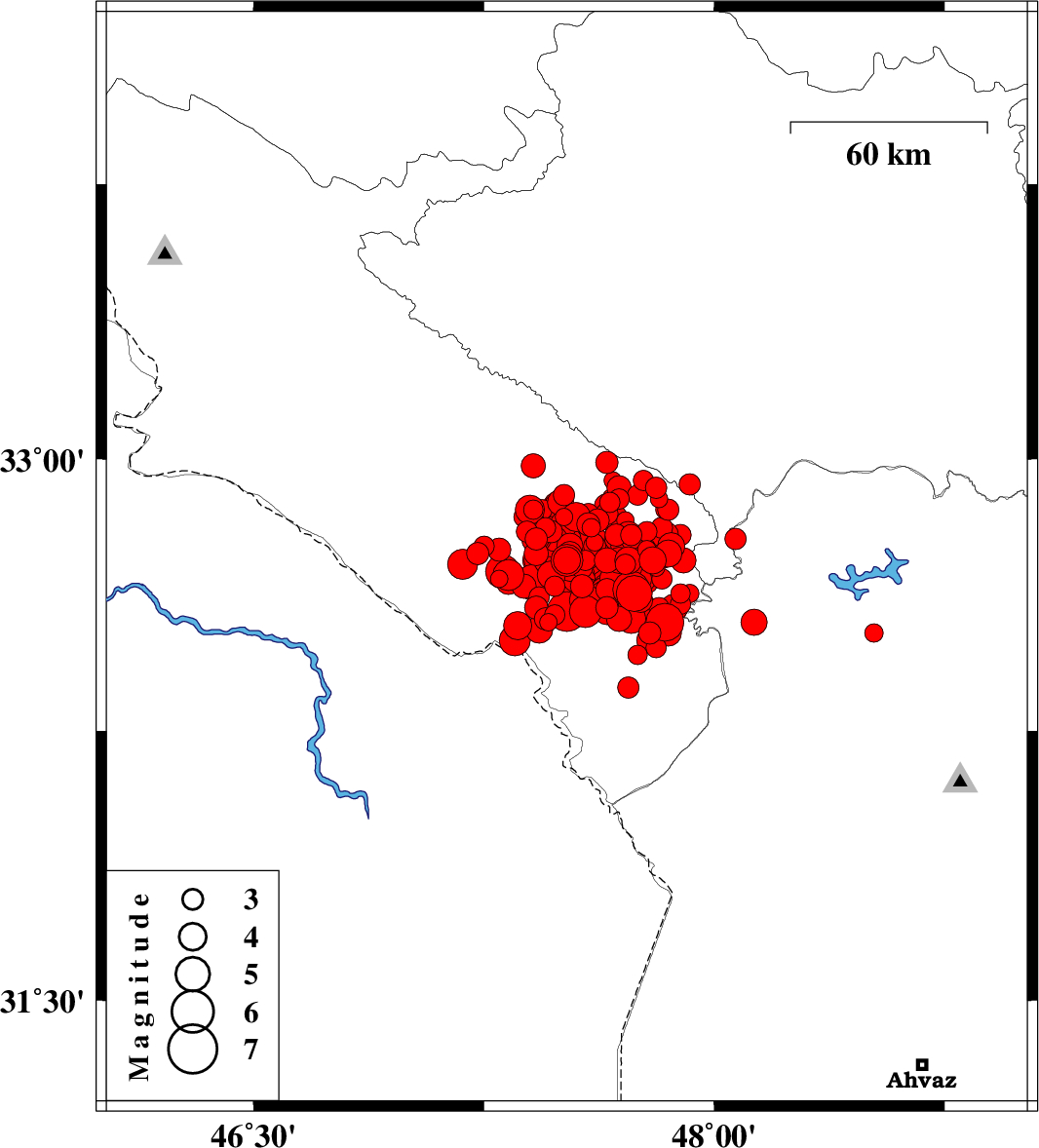 | 2014/08/26 | 01:18:10.1 | 05:48:10.1 | 32.89 | 47.69 | 14 | ML3 | Ilam Province, 21 km East of Abdanan | ||