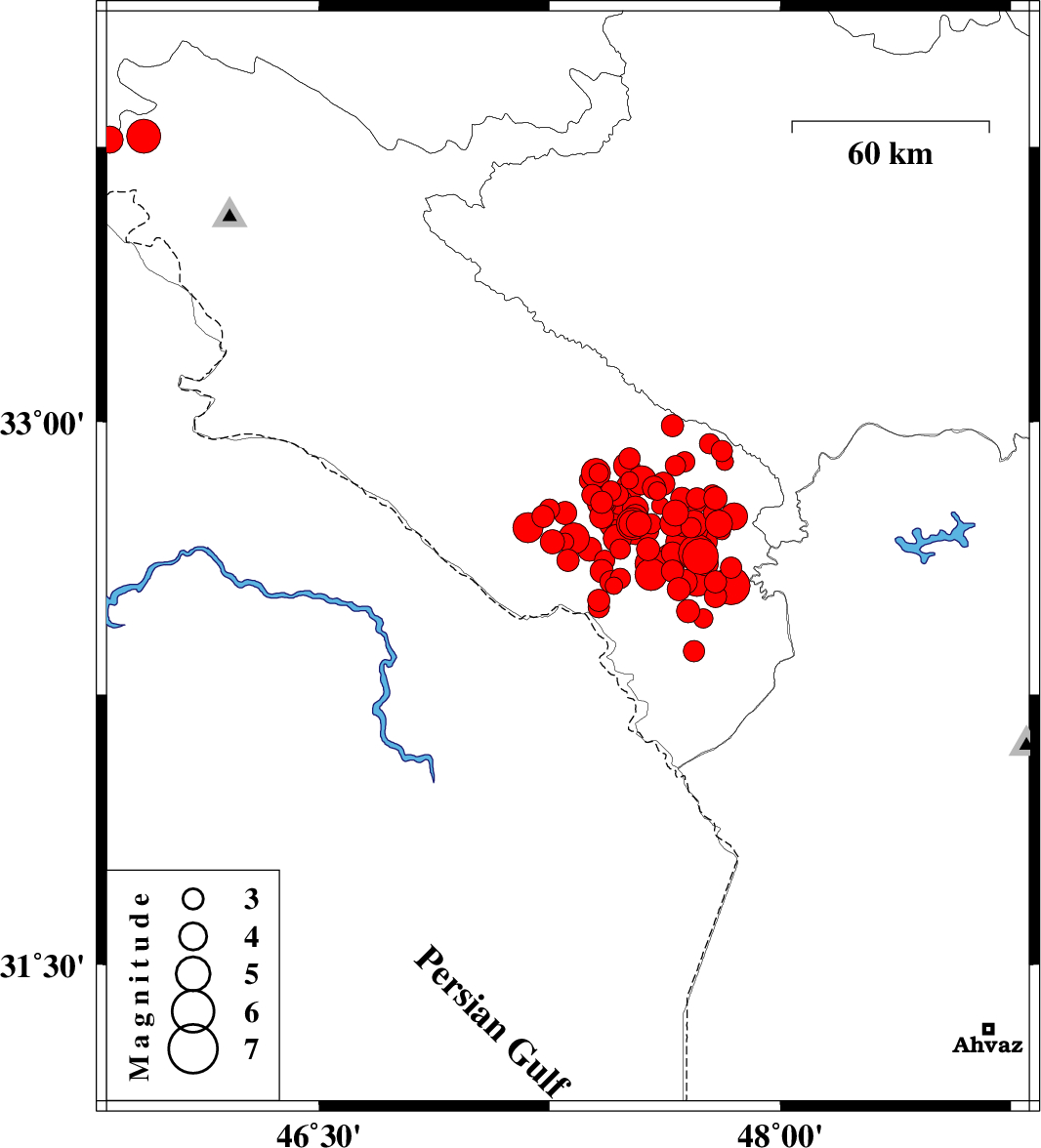 | 2014/08/26 | 01:18:10.1 | 05:48:10.1 | 32.89 | 47.69 | 14 | ML3 | Ilam Province, 21 km East of Abdanan | ||