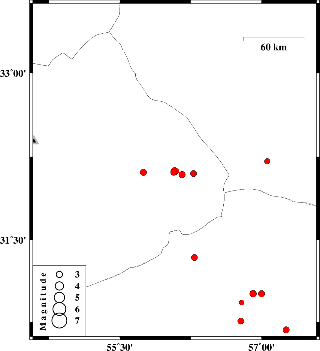 | 2014/08/19 | 04:19:10.5 | 08:49:10.5 | 31.34 | 56.29 | 14 | ML3 | Kerman Province, 50 km West of Ravar | ||