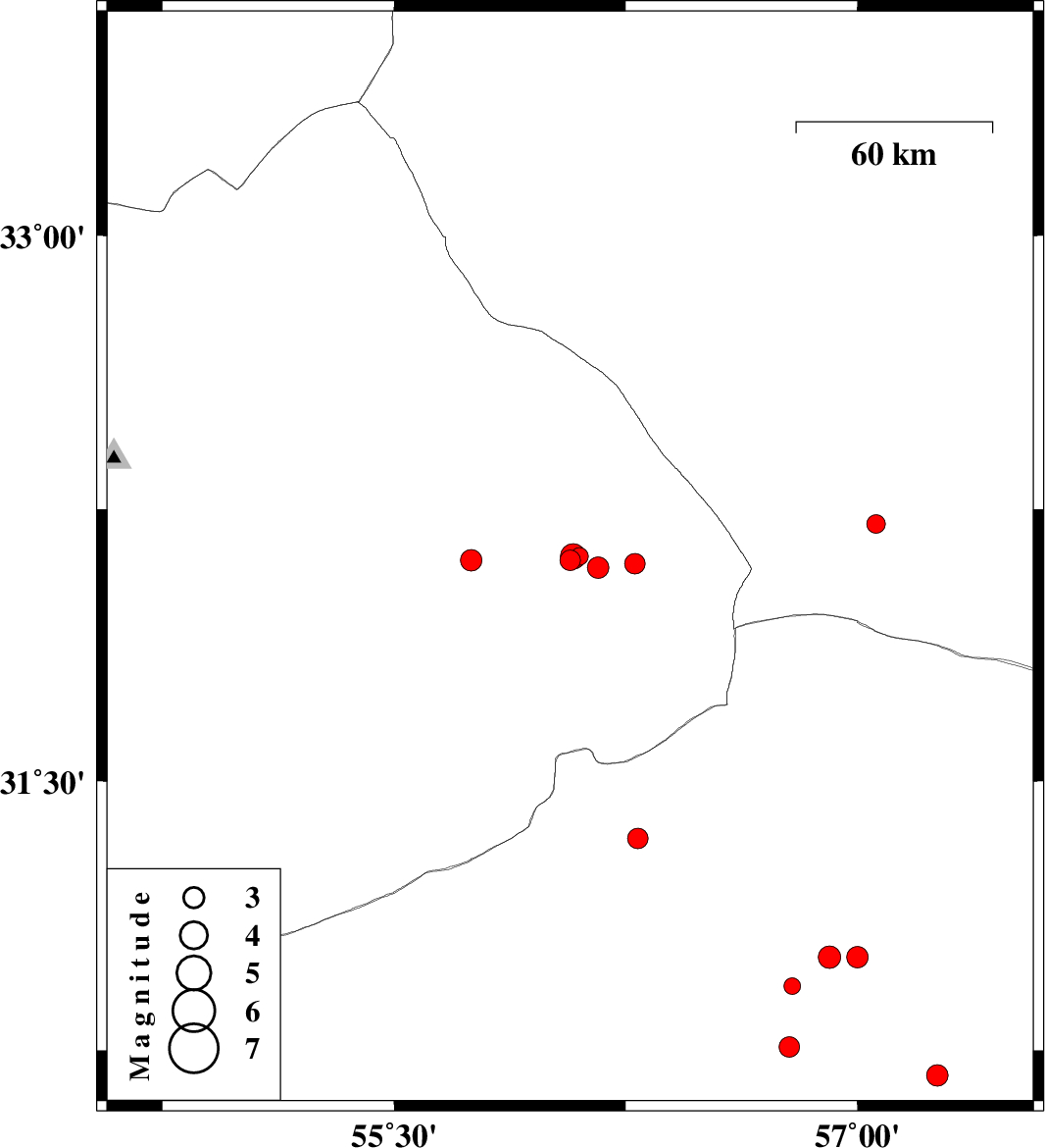 | 2014/08/19 | 04:19:10.5 | 08:49:10.5 | 31.34 | 56.29 | 14 | ML3 | Kerman Province, 50 km West of Ravar | ||