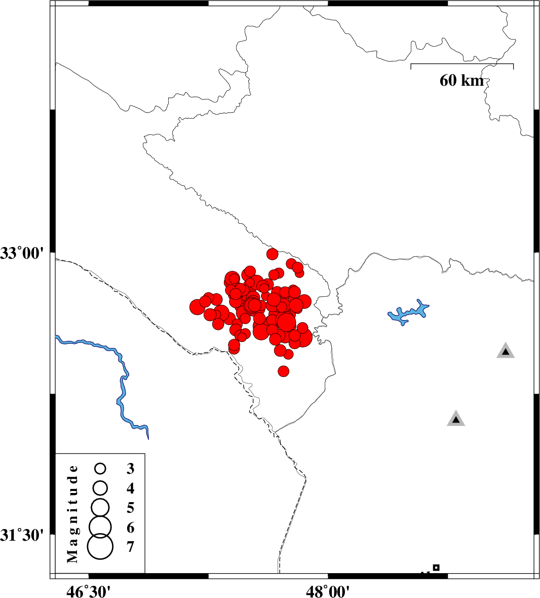 | 2014/08/26 | 03:57:56.7 | 08:27:56.7 | 32.72 | 47.8 | 46 | ML4 | Ilam Province, 49 km South of Pol-e dokhtar | ||