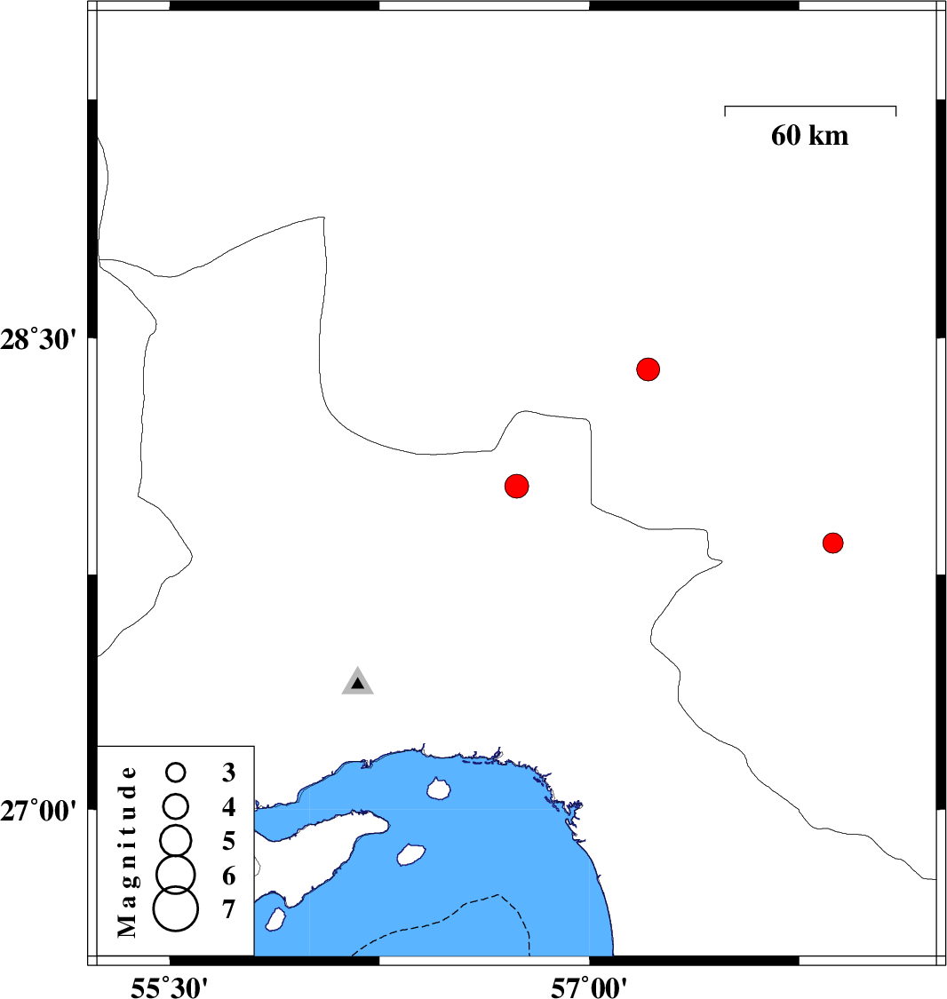 2014/07/30 | 07:46:13.7 | 12:16:13.7 | 27.85 | 57.87 | 16 | ML3.3 | Kerman Province, 20 km South-East of Kahnuj |