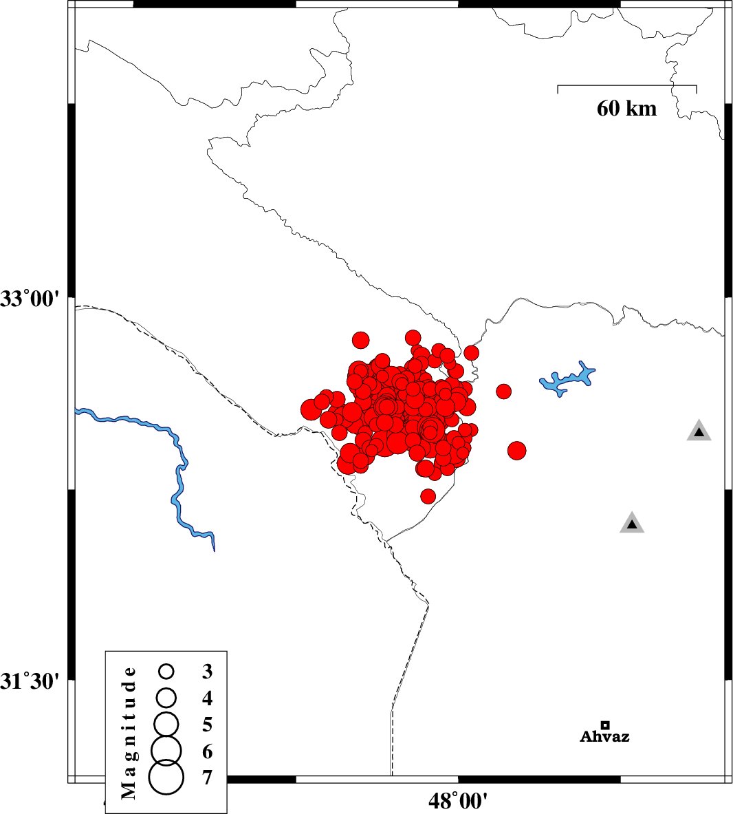 2014/08/26 | 01:31:15.9 | 06:01:15.9 | 32.65 | 47.48 | 40 | ML2.9 | Ilam Province, 22 km East of Dehloran | ||