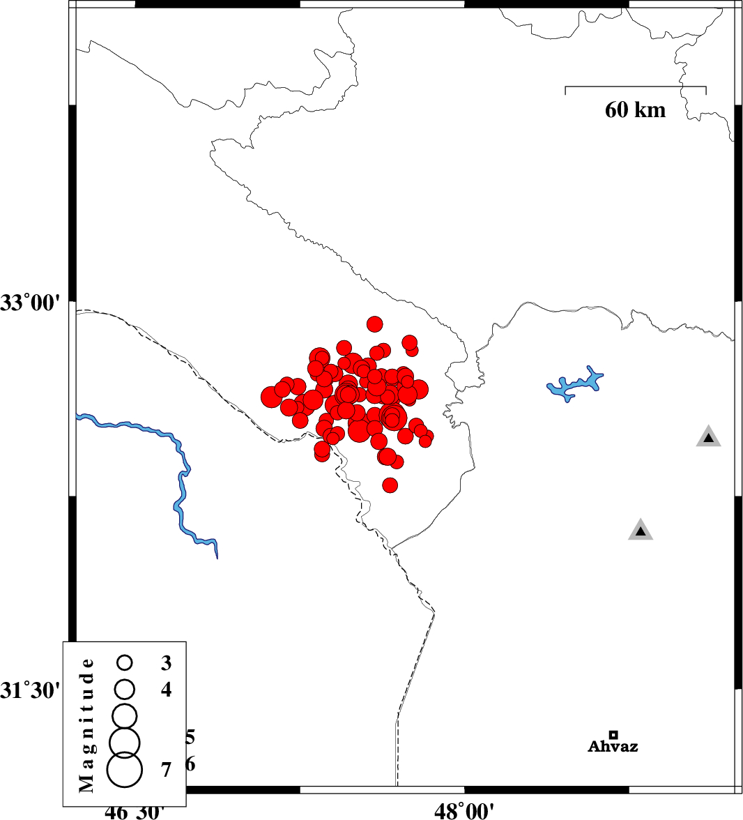 | 2014/08/26 | 01:18:10.1 | 05:48:10.1 | 32.89 | 47.69 | 14 | ML3 | Ilam Province, 21 km East of Abdanan | ||