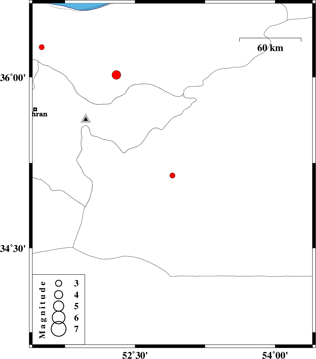 | 2014/08/16 | 23:55:56.9 | 04:25:56.9 | 36.02 | 52.3 | 6 | ML4.2 | Mazandaran Province, 50 km South of Amol |