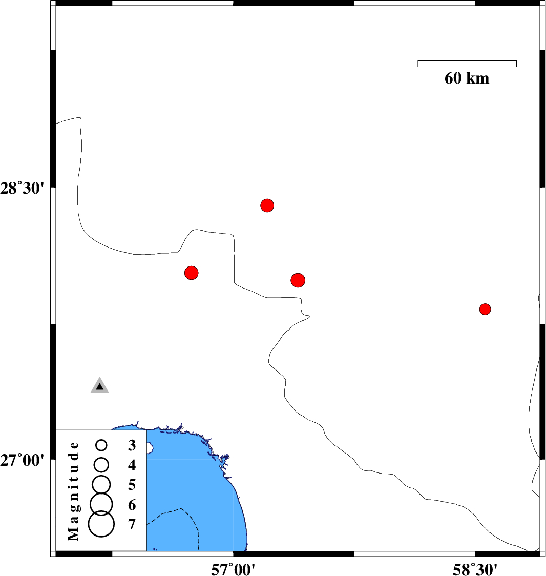 2014/08/06 | 15:55:32.8 | 20:25:32.8 | 28.4 | 57.21 | 29 | ML3.6 | Kerman Province, 59 km South-West of Jiroft |