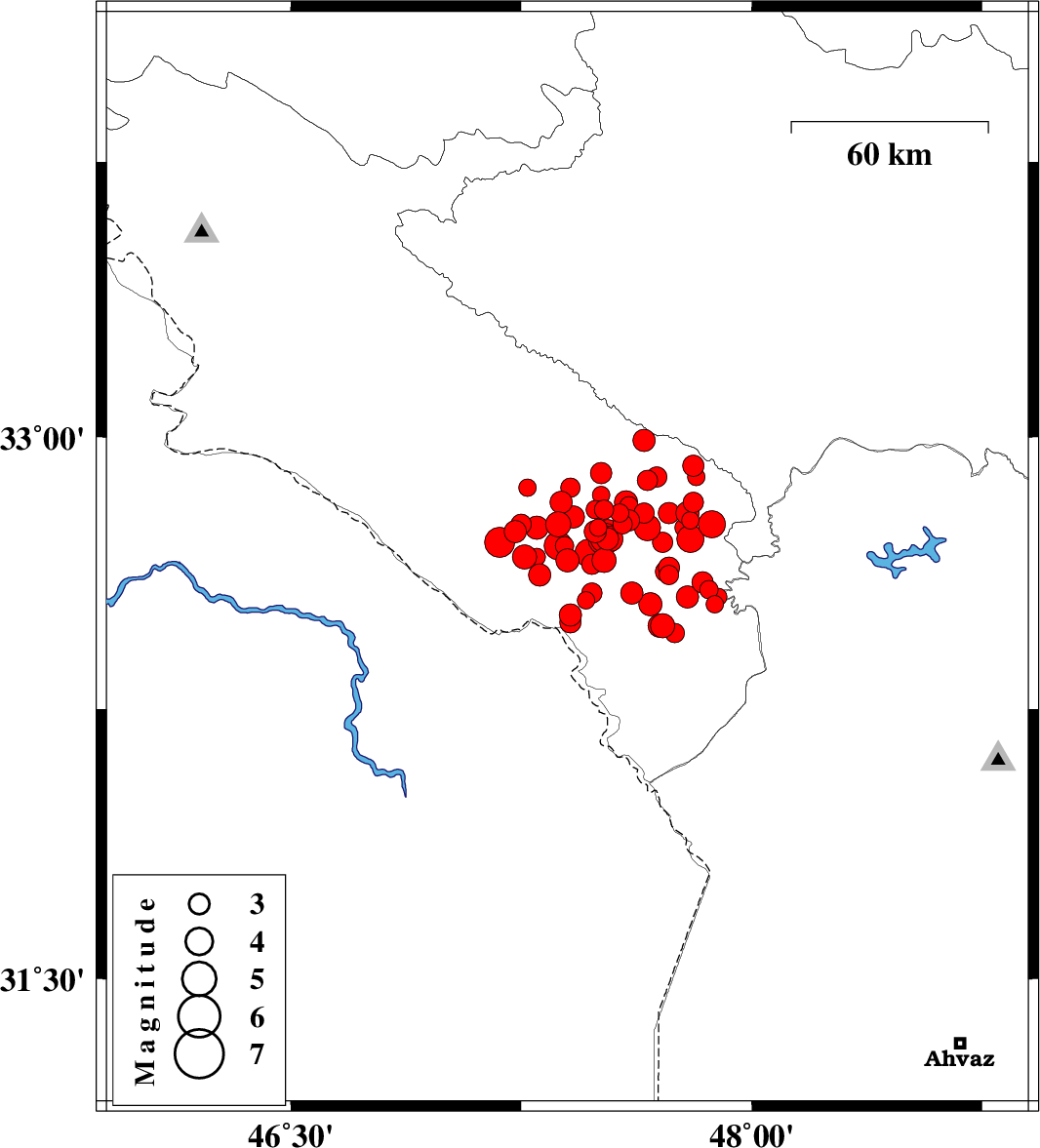 | 2014/08/26 | 01:18:10.1 | 05:48:10.1 | 32.89 | 47.69 | 14 | ML3 | Ilam Province, 21 km East of Abdanan | ||