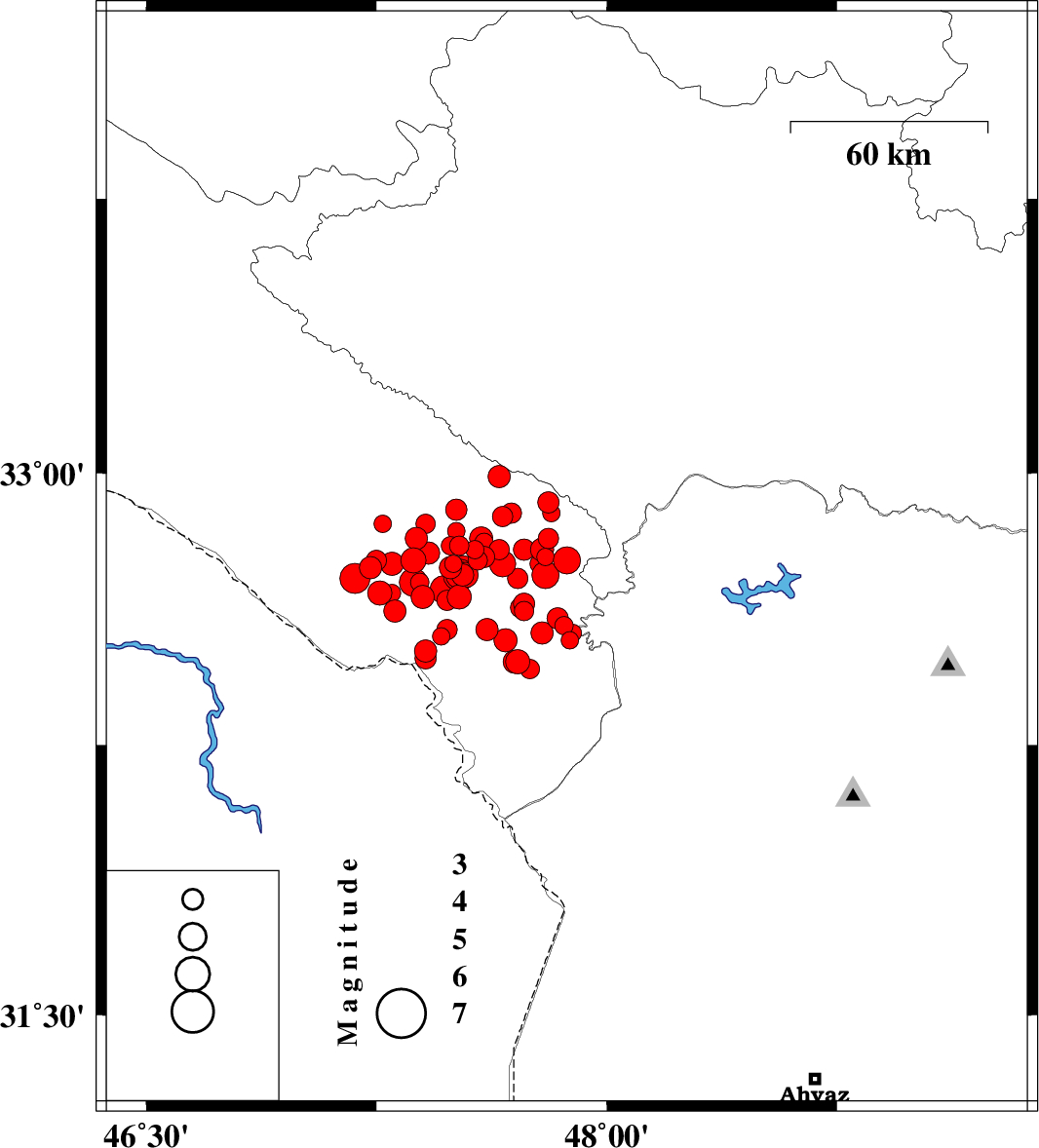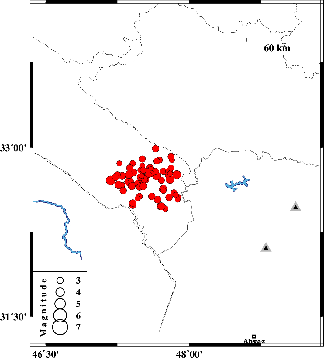 | 2014/08/26 | 01:18:10.1 | 05:48:10.1 | 32.89 | 47.69 | 14 | ML3 | Ilam Province, 21 km East of Abdanan | ||