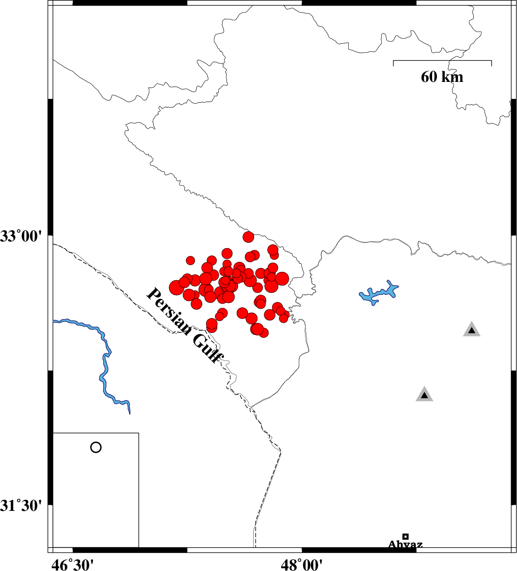 2014/08/26 | 01:31:15.9 | 06:01:15.9 | 32.65 | 47.48 | 40 | ML2.9 | Ilam Province, 22 km East of Dehloran | ||