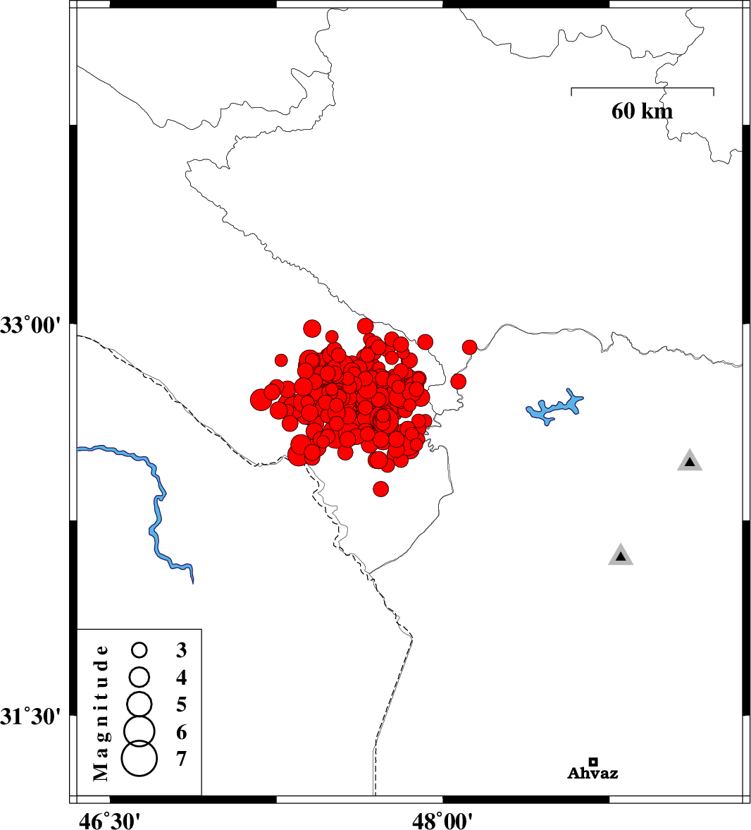 | 2014/08/26 | 01:18:10.1 | 05:48:10.1 | 32.89 | 47.69 | 14 | ML3 | Ilam Province, 21 km East of Abdanan | ||