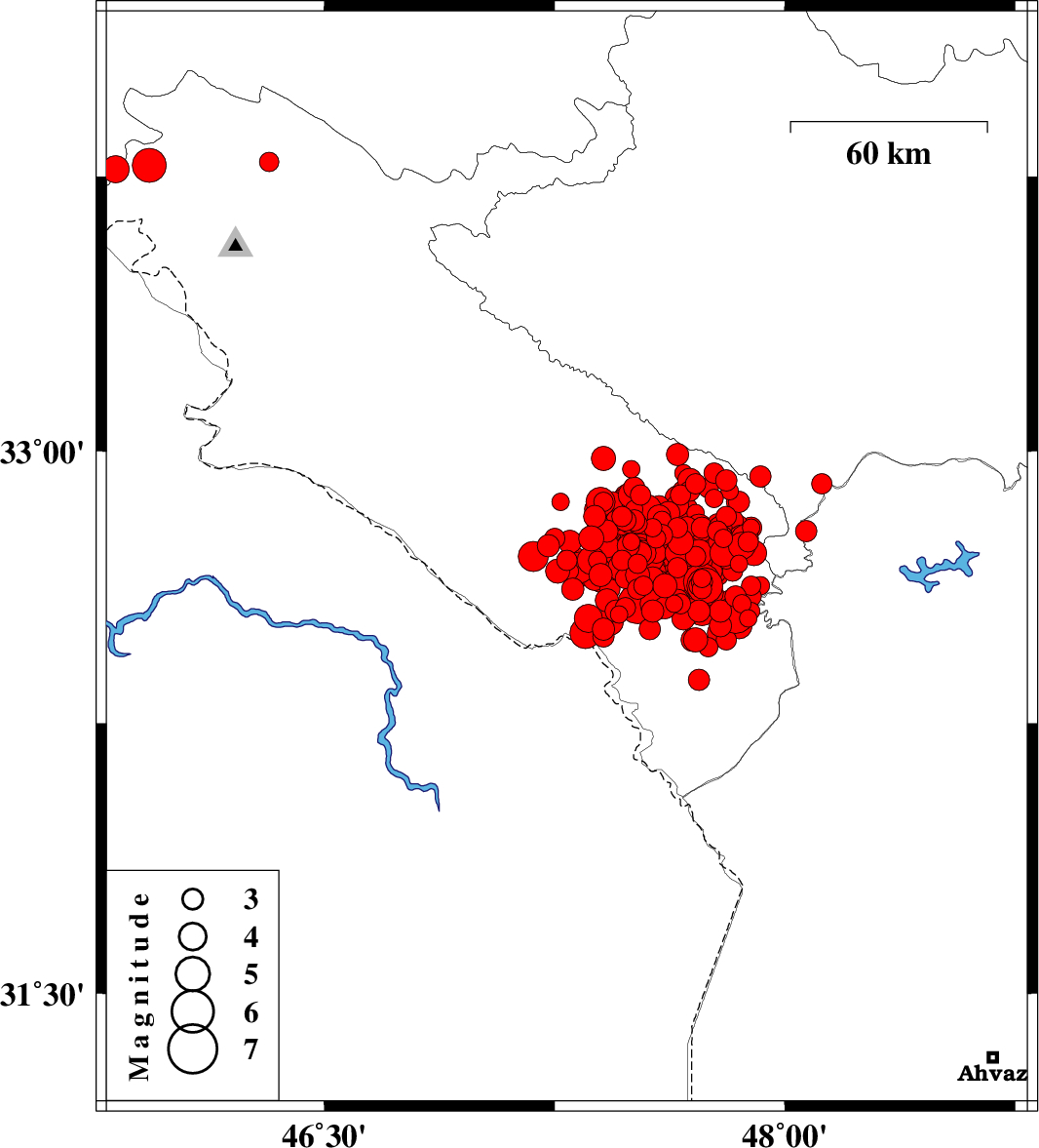 | 2014/08/26 | 01:18:10.1 | 05:48:10.1 | 32.89 | 47.69 | 14 | ML3 | Ilam Province, 21 km East of Abdanan | ||