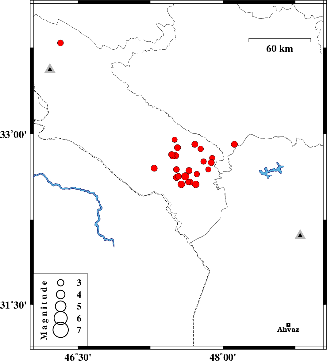 | 2014/09/05 | 13:50:57.2 | 18:20:57.2 | 32.56 | 47.72 | 14 | ML3.2 | Ilam Province, 45 km South-East of Dehloran | ||