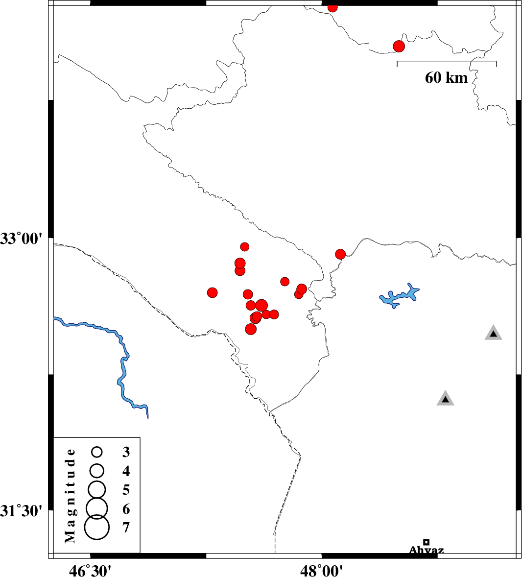 | 2014/09/12 | 15:17:29.3 | 19:47:29.3 | 32.5 | 47.54 | 18 | ML3.2 | Ilam Province, 34 km South-East of Dehloran | ||