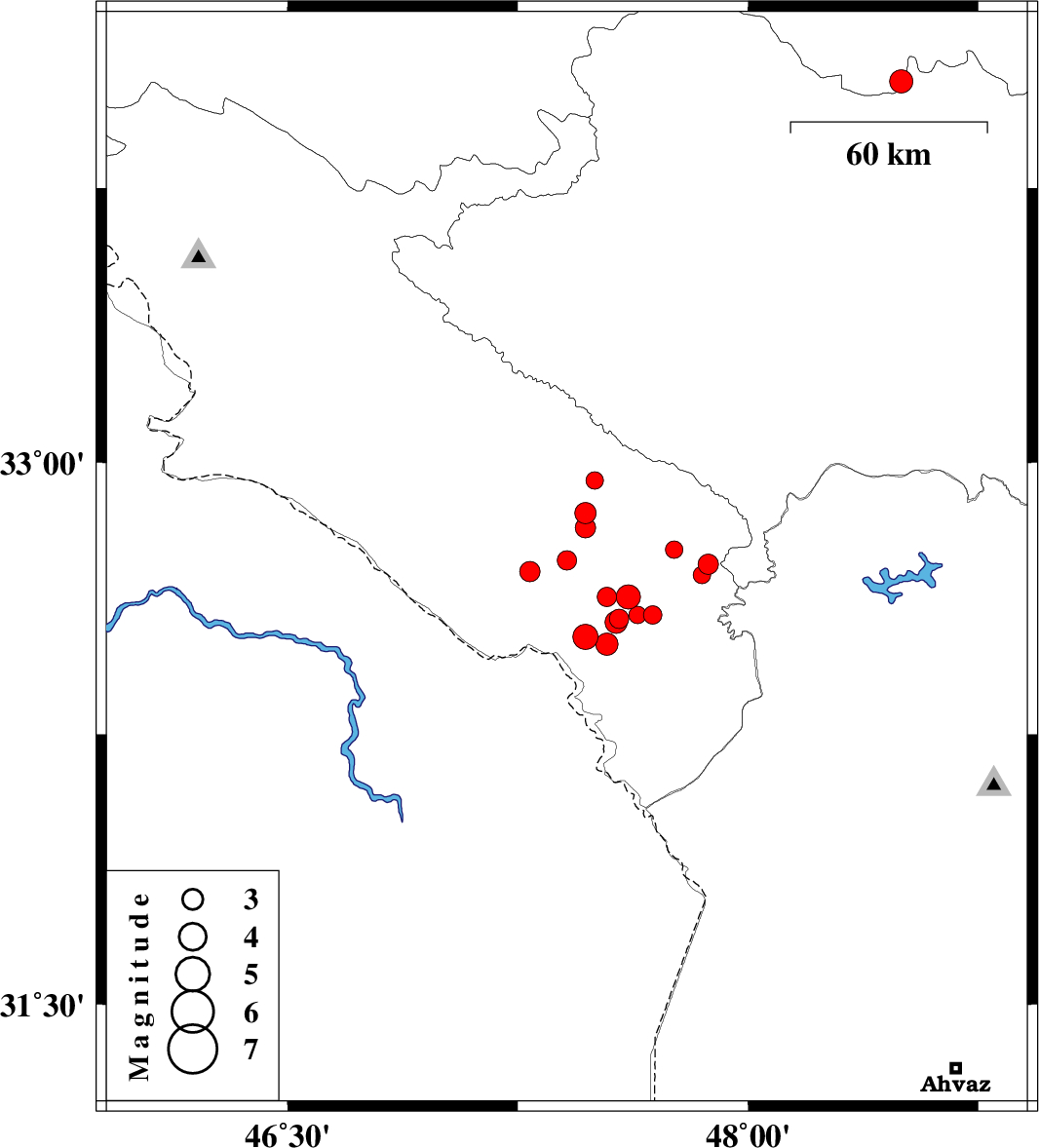| 2014/09/12 | 15:17:29.3 | 19:47:29.3 | 32.5 | 47.54 | 18 | ML3.2 | Ilam Province, 34 km South-East of Dehloran | ||