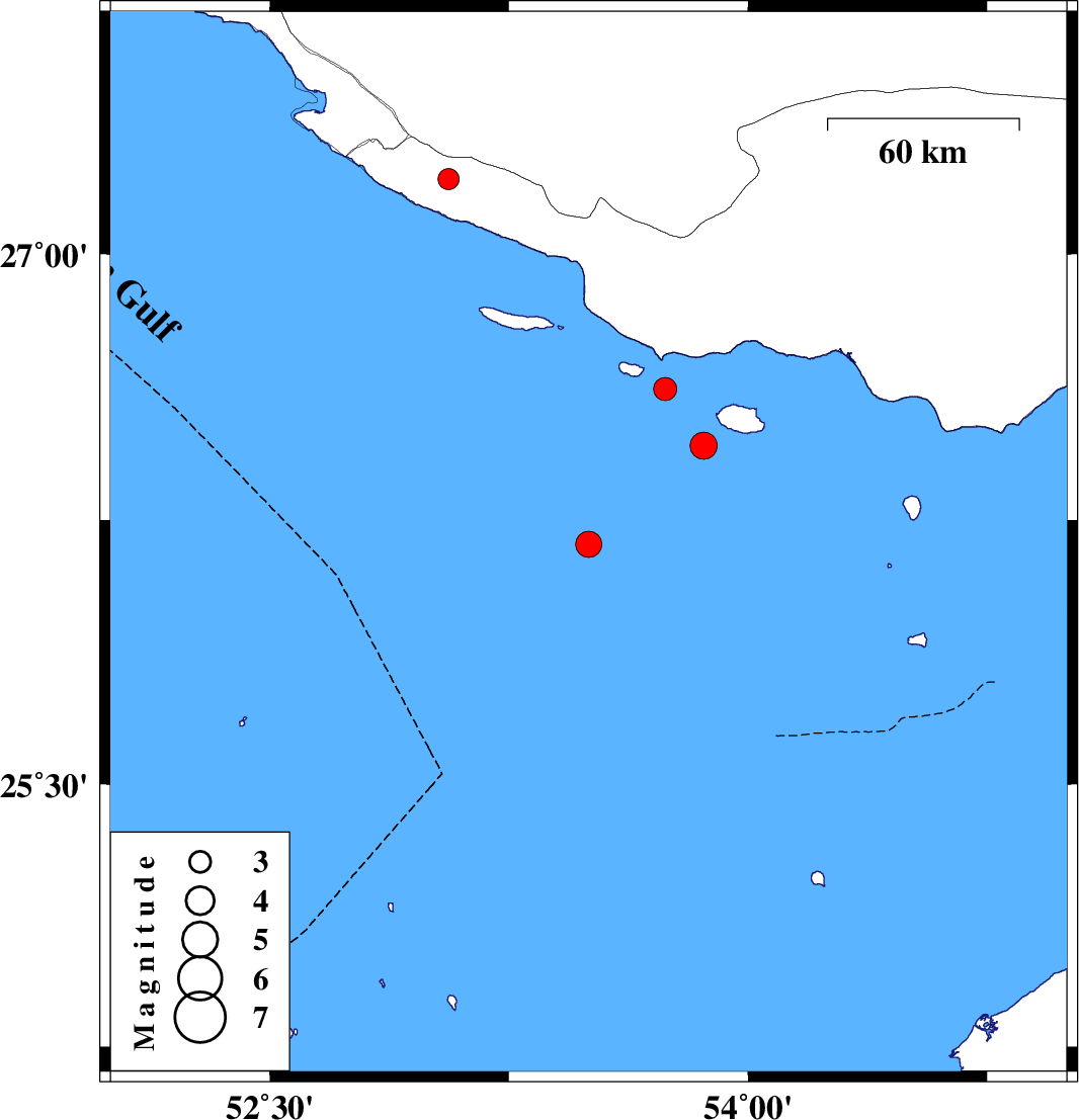 | 2014/09/15 | 07:08:04.8 | 11:38:04.8 | 26.62 | 53.74 | 16 | ML3.3 | Persian Gulf, 89 km South-West of Bastak | ||