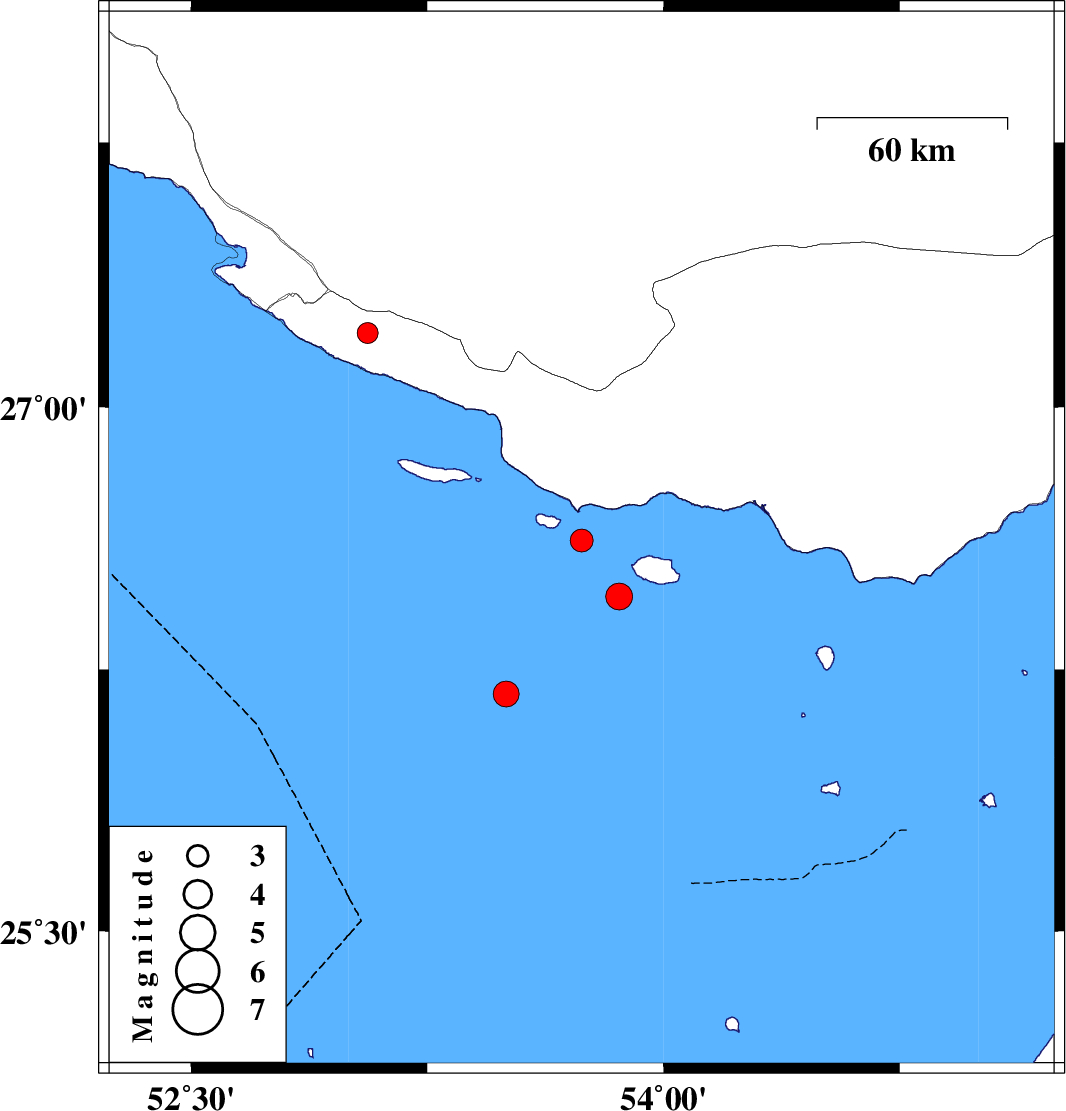 | 2014/09/15 | 07:08:04.8 | 11:38:04.8 | 26.62 | 53.74 | 16 | ML3.3 | Persian Gulf, 89 km South-West of Bastak | ||