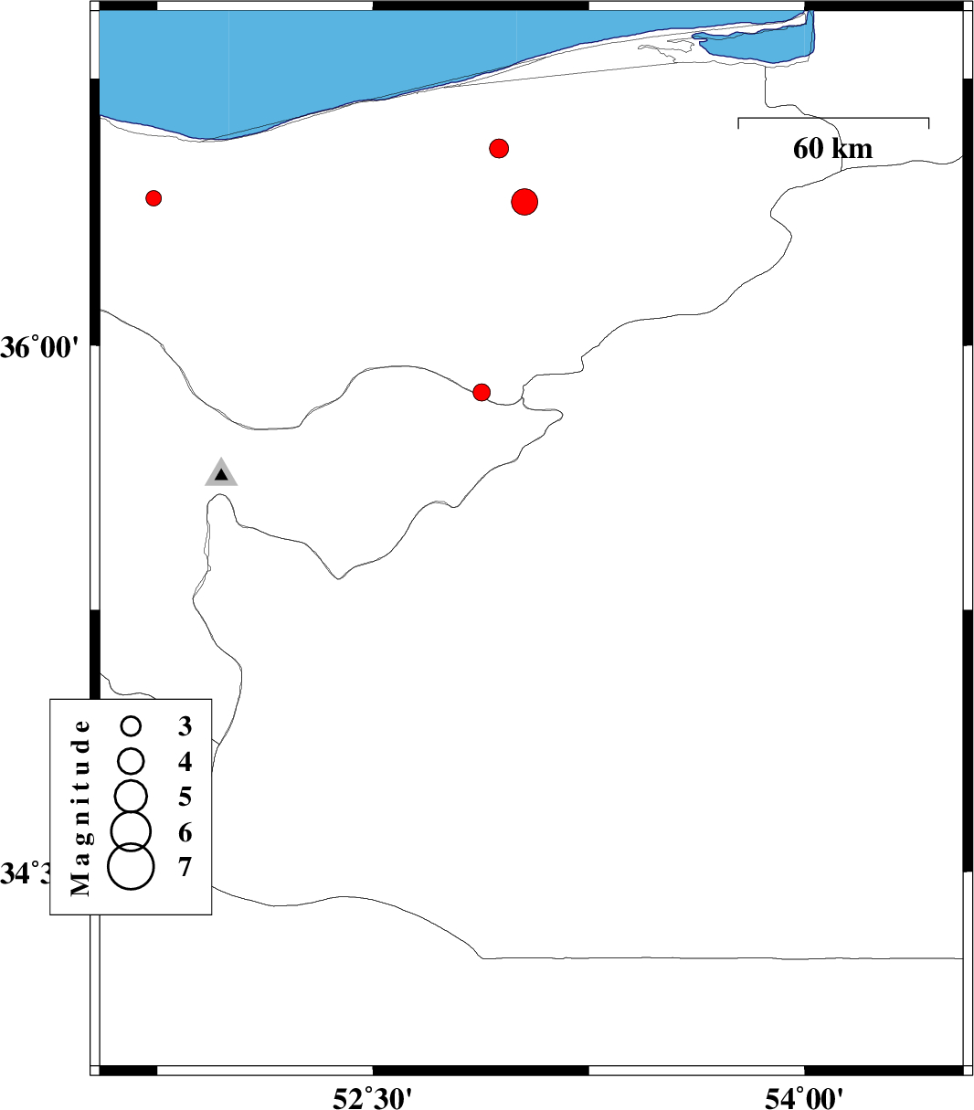 | 2014/09/16 | 00:39:43.7 | 05:09:43.7 | 35.98 | 53.2 | 6 | ML4.1 | Mazandaran Province, 20 km South-East of Pol-E-Sefid |