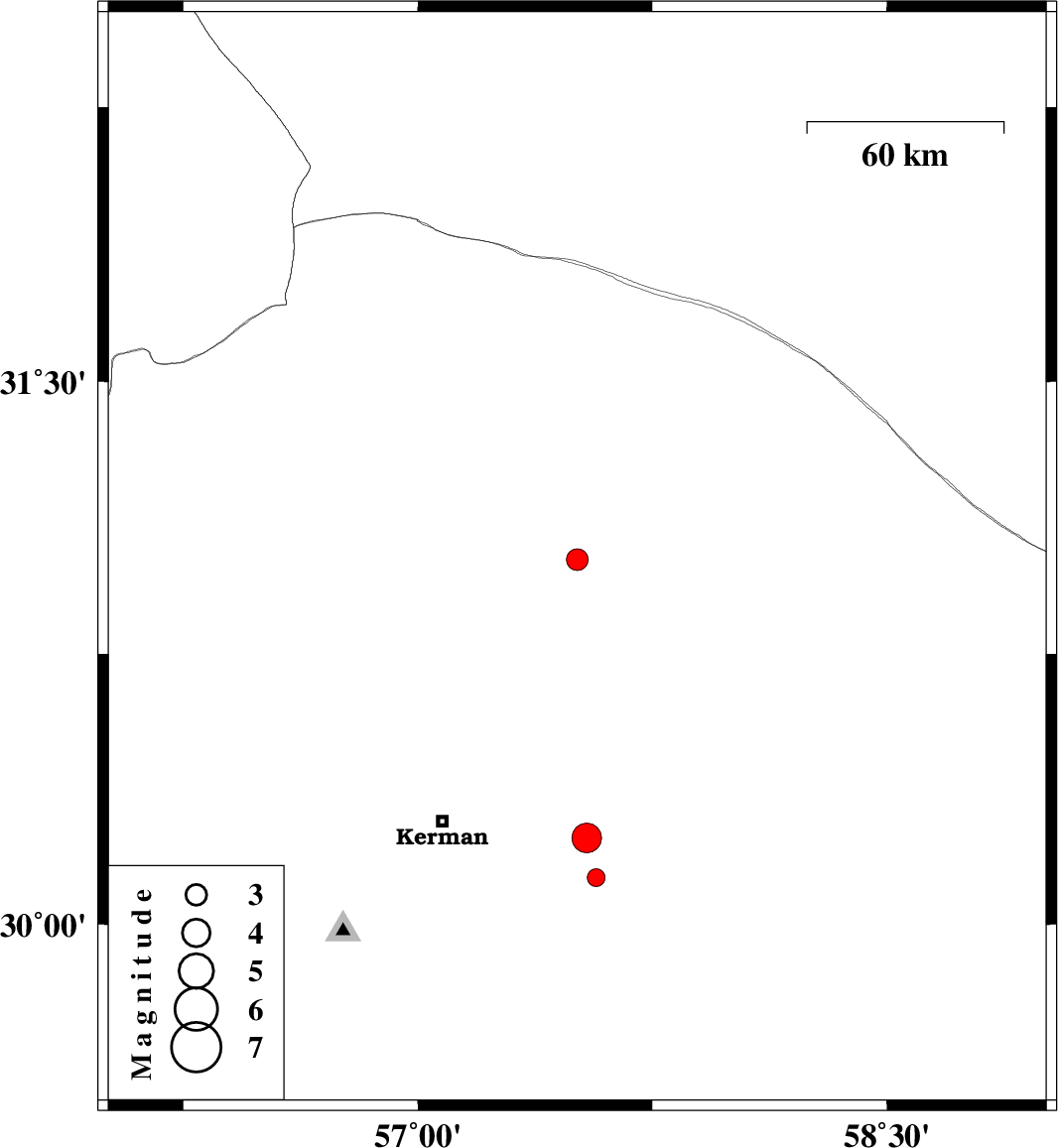 | 2014/09/16 | 19:38:56.8 | 00:08:56.8 | 30.13 | 57.57 | 16 | ML2.6 | Kerman Province, 51 km South-East of Kerman | ||