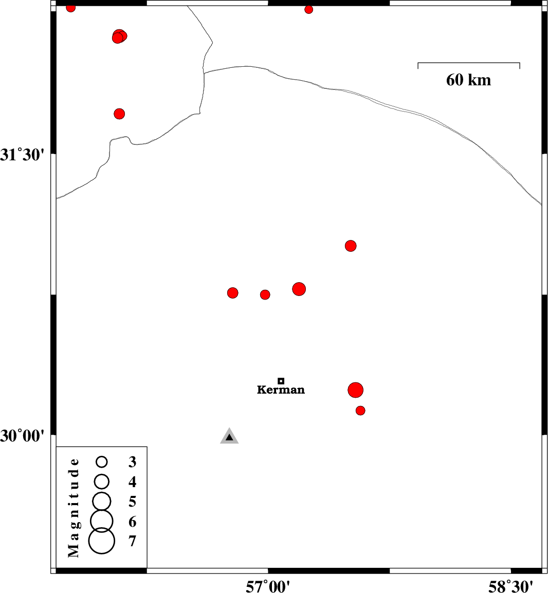 | 2014/09/22 | 06:26:05.9 | 09:56:05.9 | 30.78 | 57.19 | 14 | ML3.7 | Kerman Province, 55 km North-East of Kerman | ||