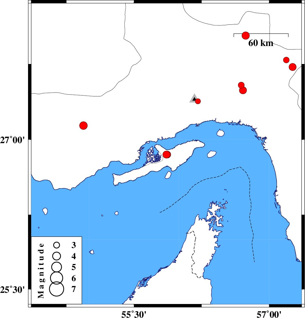 2014/09/24 | 14:25:45.4 | 17:55:45.4 | 26.85 | 55.86 | 7 | ML3.7 | Persian Gulf, 42 km South-West of Qeshm | ||