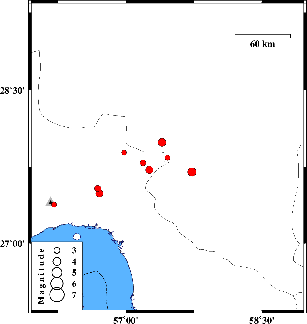 | 2014/09/24 | 18:44:10.0 | 22:14:10.0 | 27.7 | 57.73 | 14 | ML4.2 | Kerman Province, 28 km South of Kahnuj | ||