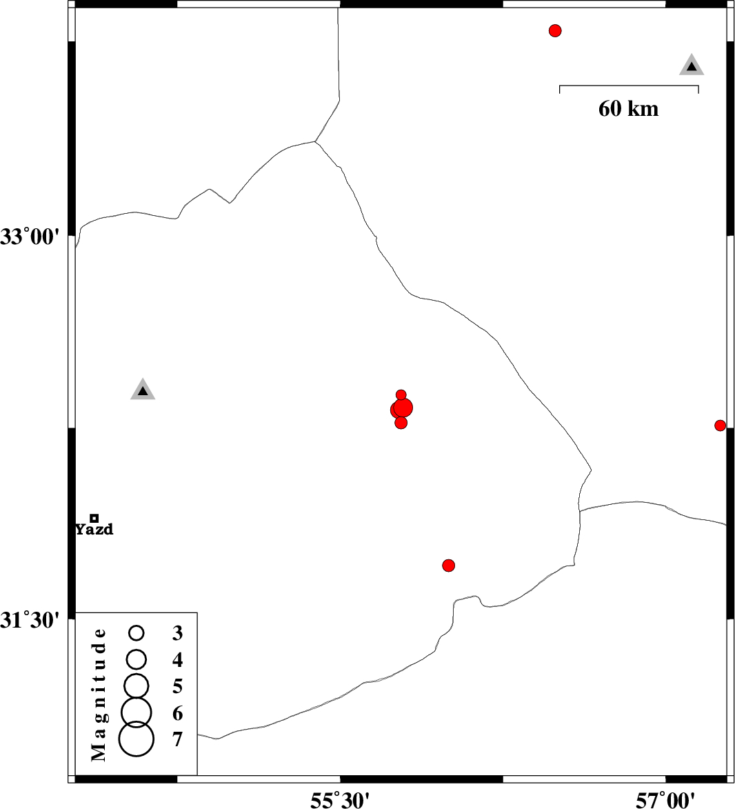 | 2014/09/12 | 12:00:29.4 | 16:30:29.4 | 32.32 | 55.77 | 18 | ML3.5 | Yazd Province, 87 km North-East of Bafq | ||
