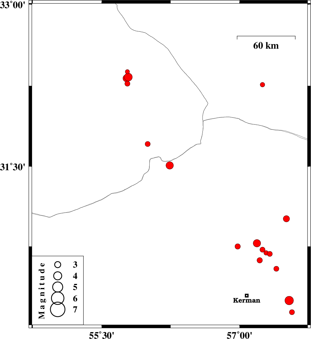 | 2014/09/22 | 06:26:05.9 | 09:56:05.9 | 30.78 | 57.19 | 14 | ML3.7 | Kerman Province, 55 km North-East of Kerman | ||