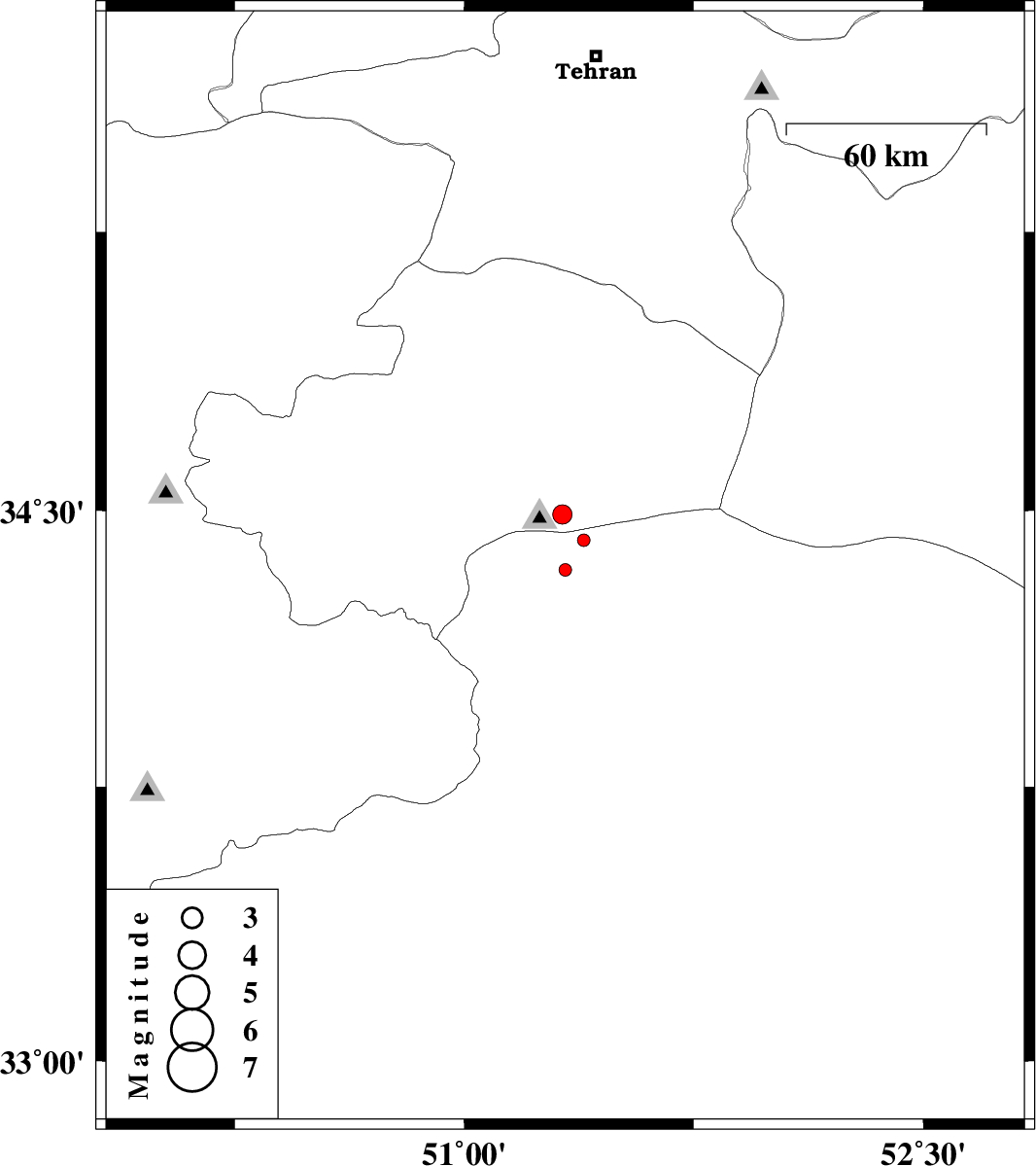 | 2014/10/03 | 15:51:54.1 | 19:21:54.1 | 34.49 | 51.32 | 6 | ML2.8 | Qom Province, 50 km North-West of Aran va bidgol | ||
