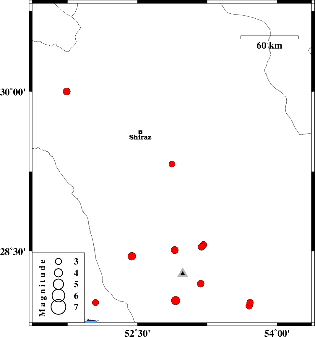 2014/09/25 | 08:56:56.9 | 12:26:56.9 | 30 | 51.74 | 46 | ML3.5 | Fars Province, 24 km South-East of Nurabad | ||