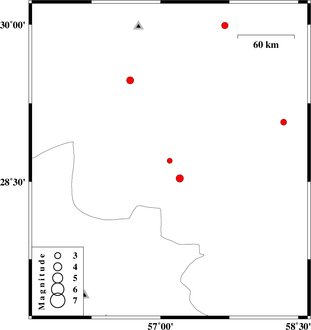 | 2014/09/30 | 22:44:00.3 | 02:14:00.3 | 29.99 | 57.7 | 17 | ML3.3 | Kerman Province, 69 km South-East of Kerman | ||