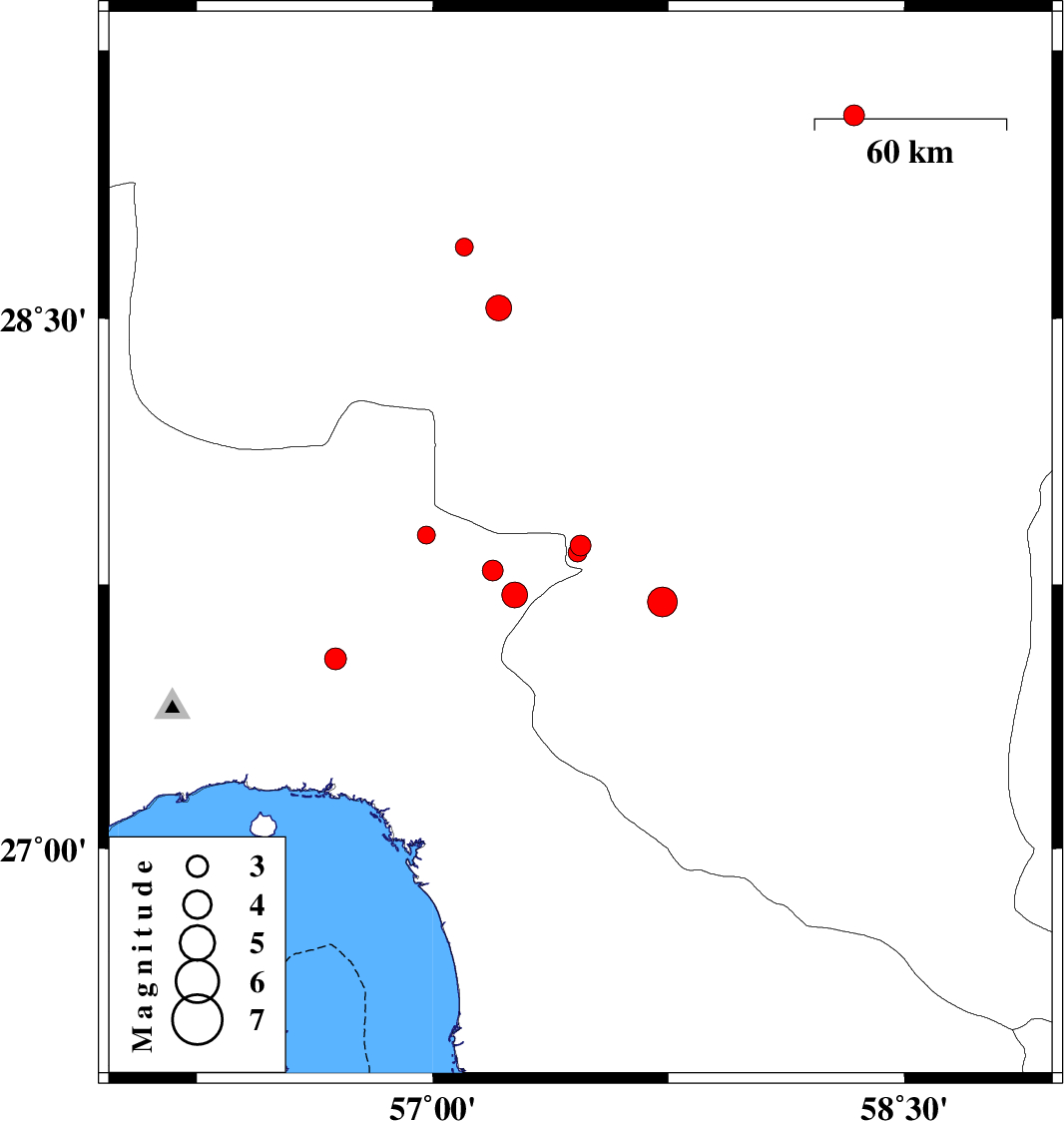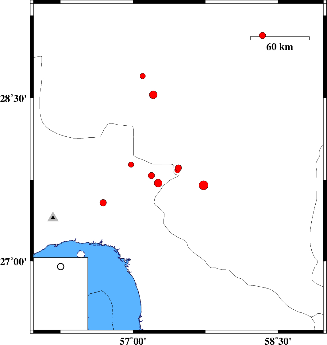 | 2014/10/07 | 17:49:49.6 | 21:19:49.6 | 27.86 | 57.47 | 14 | ML2.9 | Kerman Province, 24 km West of Kahnuj | ||