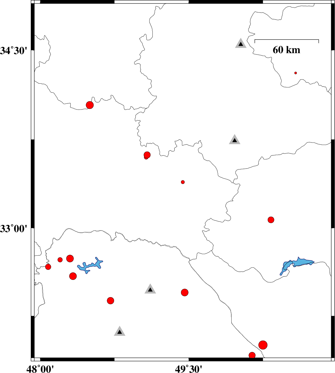 2014/10/10 | 19:57:55.1 | 23:27:55.1 | 33.62 | 49.08 | 6 | ML2.9 | Lorestan Province, 15 km North of Dorud | ||