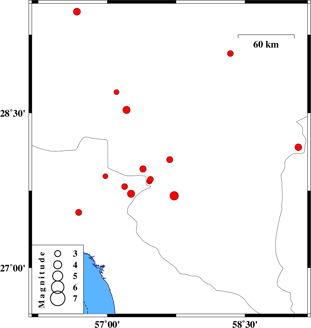 | 2014/09/12 | 00:57:52.0 | 05:27:52.0 | 27.54 | 56.69 | 28 | ML3.1 | Hormozgan Province, 56 km North-West of Dehbarez |
