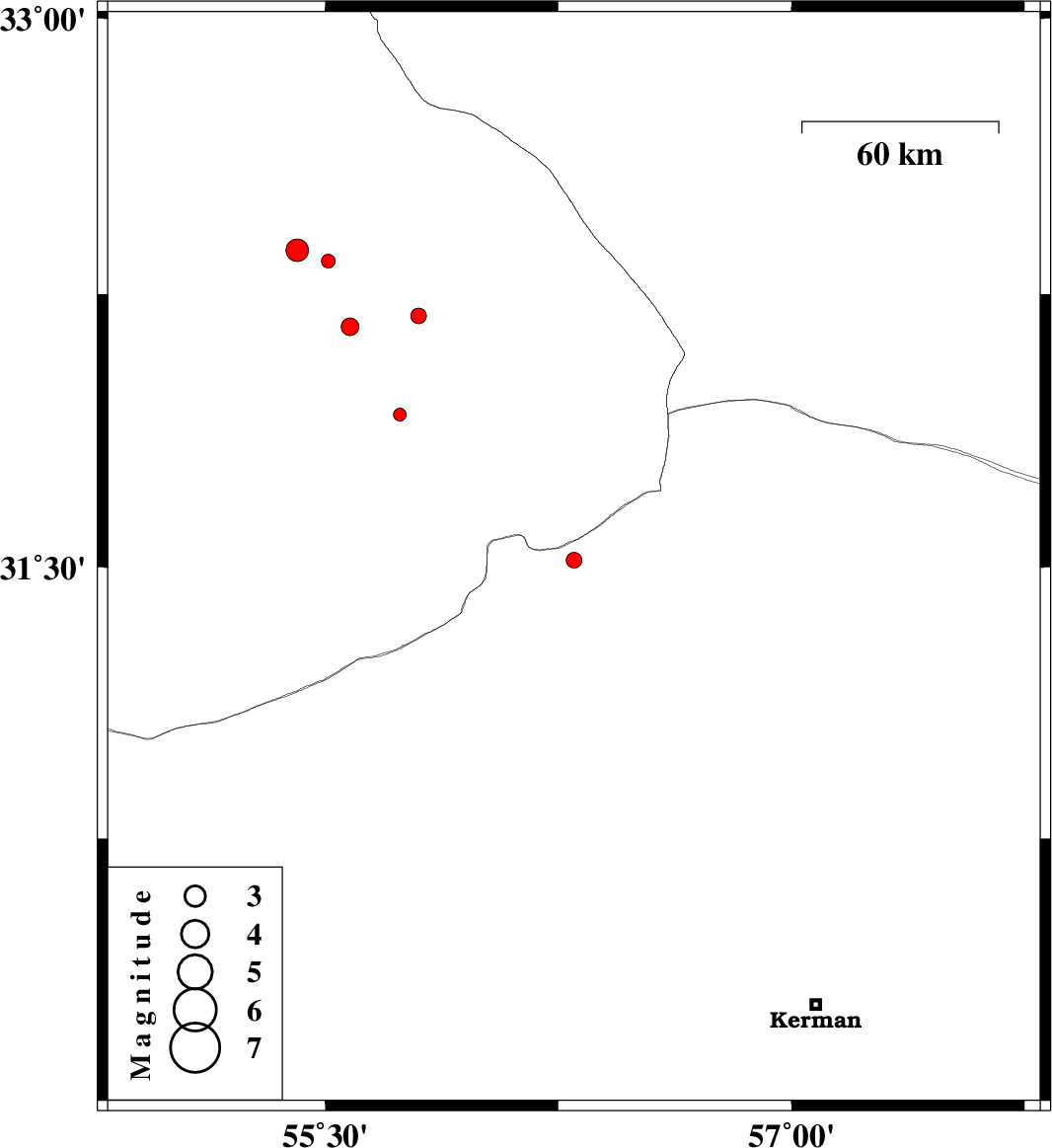 | 2014/10/07 | 17:02:09.2 | 20:32:09.2 | 32.37 | 55.41 | 14 | ML3.3 | Yazd Province, 86 km North of Bafq | ||
