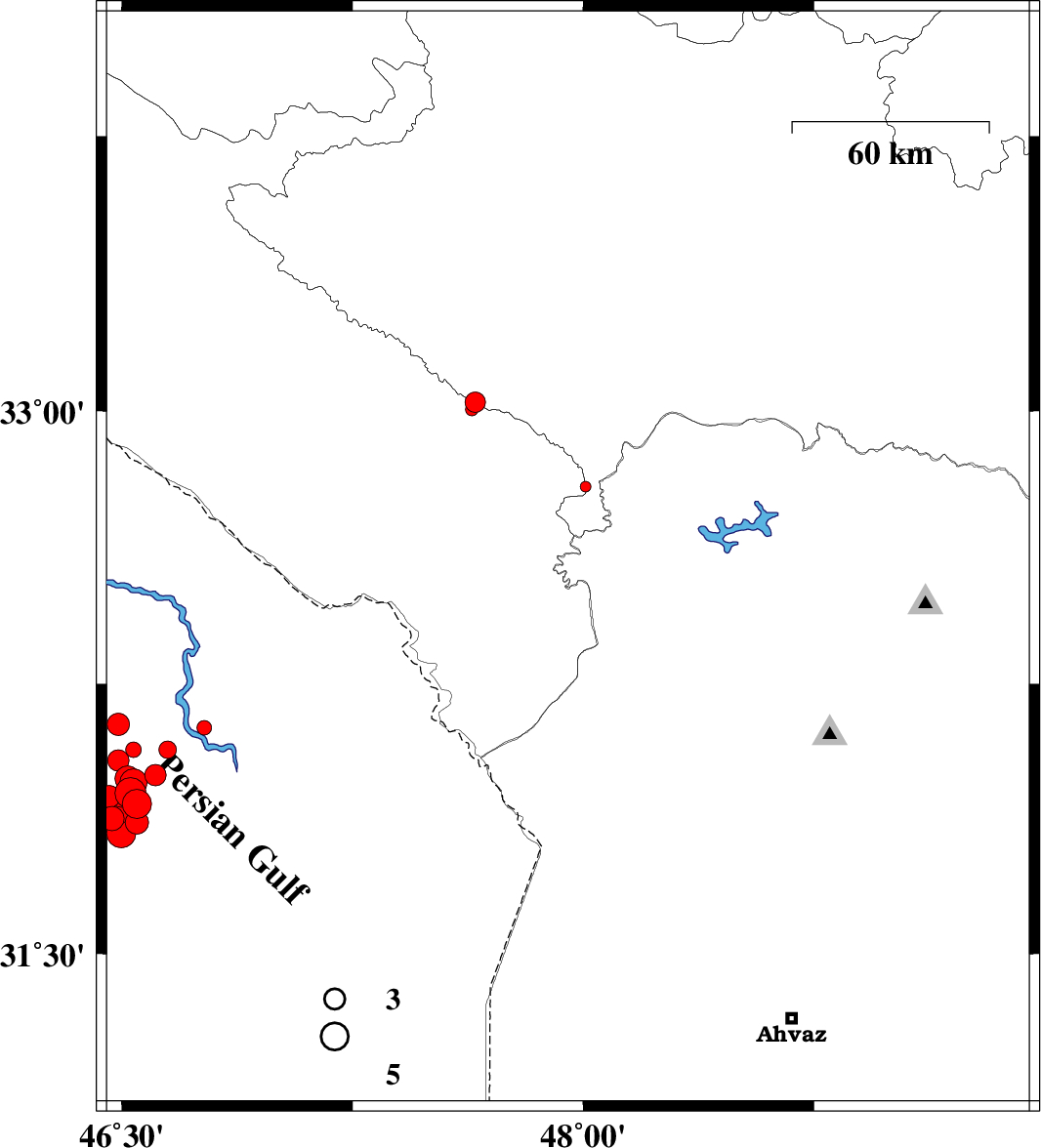 2014/10/15 | 13:35:55.4 | 17:05:55.4 | 32.57 | 47.75 | 18 | ML5.6 | Ilam Province, 48 km South-East of Dehloran | ||