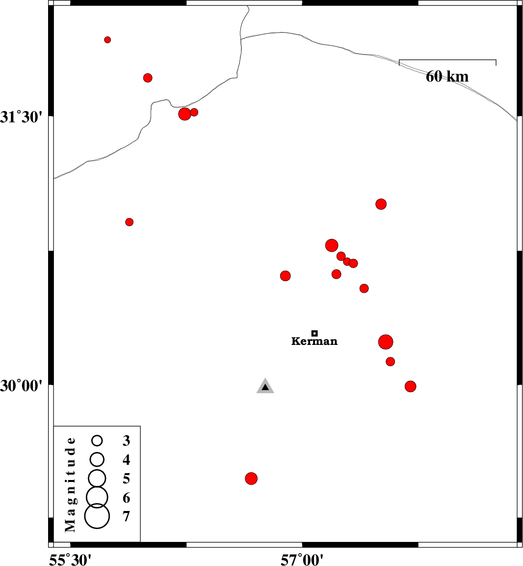 | 2014/09/30 | 22:44:00.3 | 02:14:00.3 | 29.99 | 57.7 | 17 | ML3.3 | Kerman Province, 69 km South-East of Kerman | ||