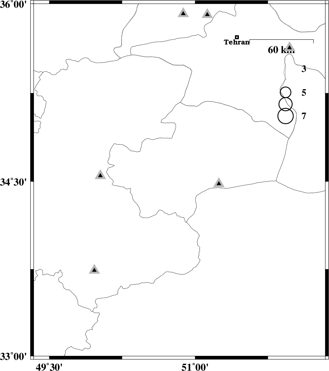| 2014/10/05 | 09:43:43.9 | 13:13:43.9 | 35.98 | 52.26 | 6 | ML1.8 | Mazandaran Province, 33 km North-East of Damavand | ||