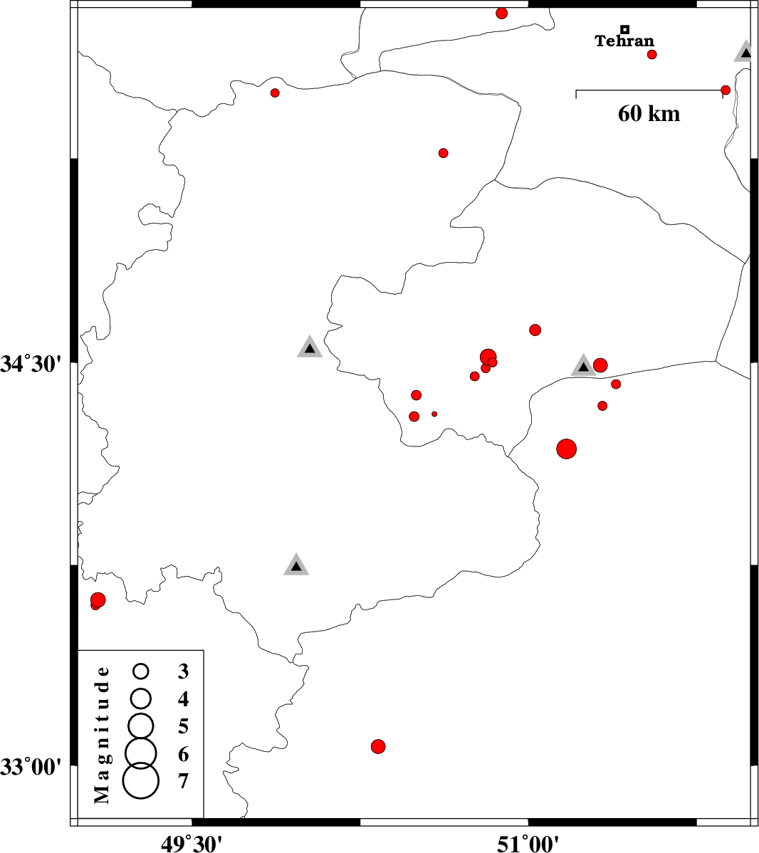 | 2014/09/19 | 07:33:31.5 | 12:03:31.5 | 34.31 | 50.58 | 15 | ML1 | Qom Province, 36 km North of Delijan |