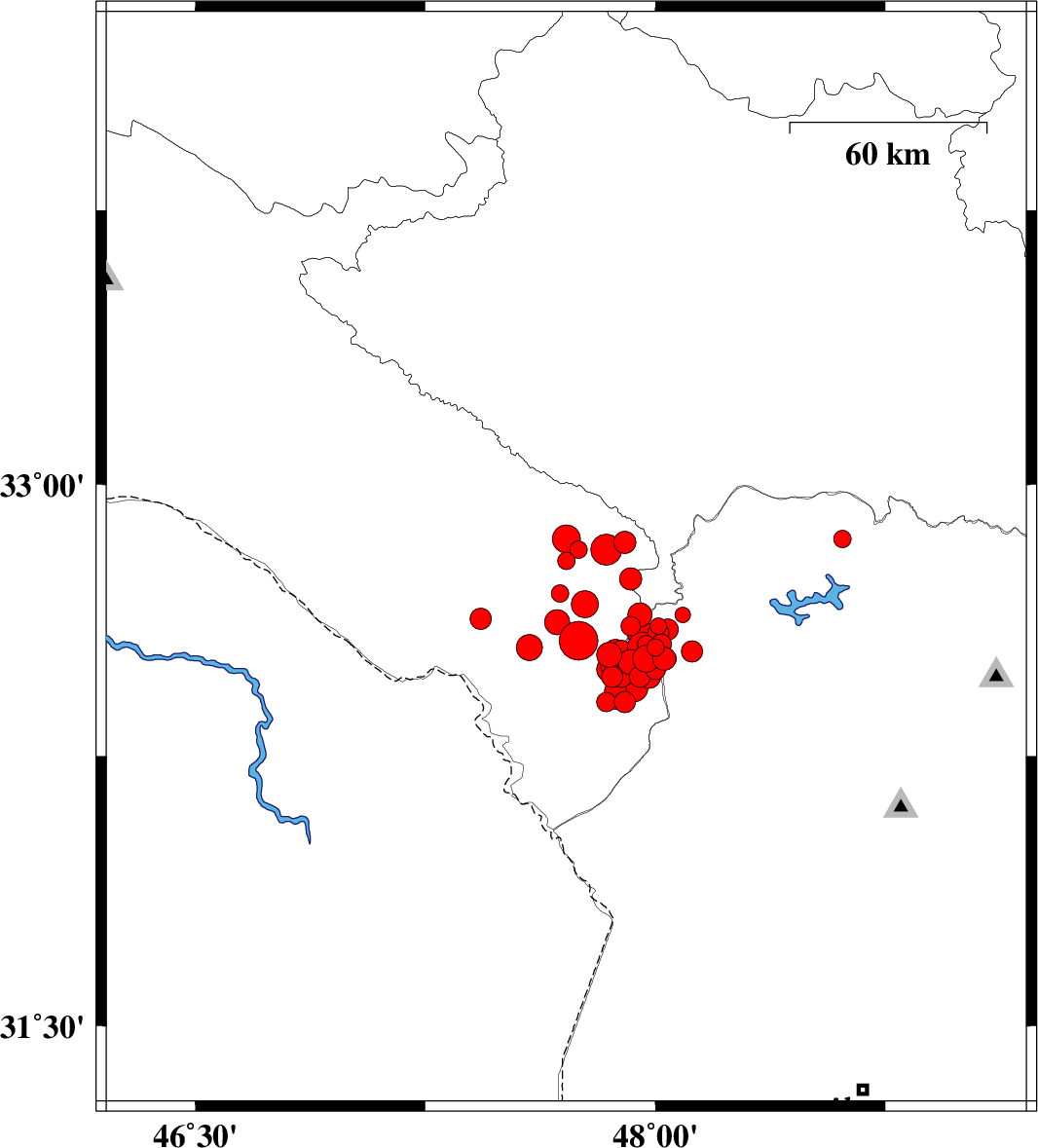 | 2014/10/16 | 00:27:18.5 | 03:57:18.5 | 32.82 | 47.84 | 14 | ML4.5 | Ilam Province, 39 km South-East of Pol-e dokhtar | ||