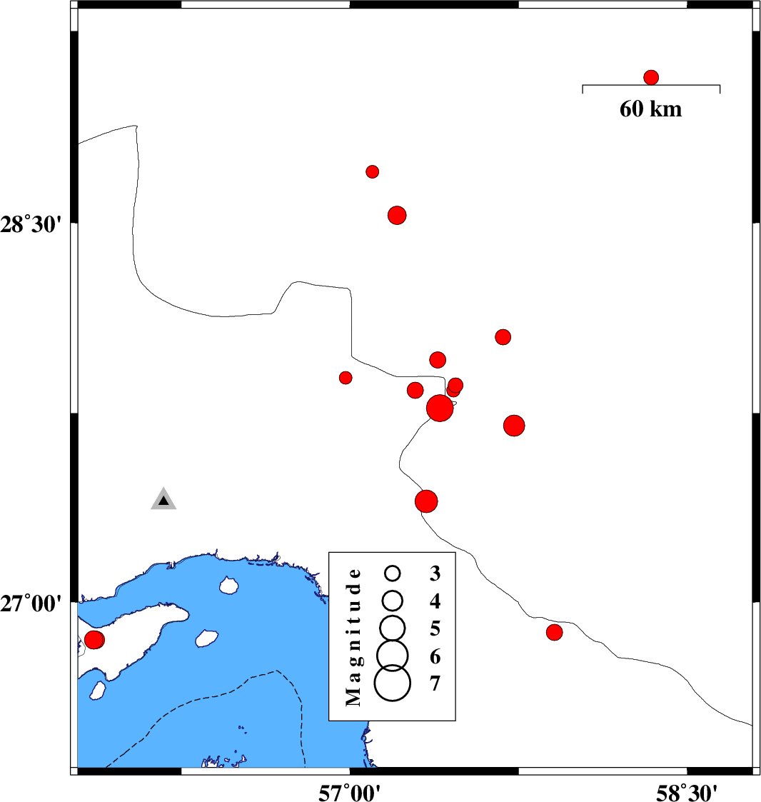 | 2014/10/08 | 05:59:39.8 | 09:29:39.8 | 27.96 | 57.39 | 14 | ML3.3 | Kerman Province, 30 km West of Kahnuj | ||